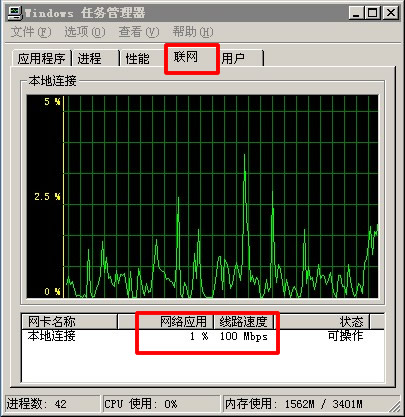 在服務器托管到機房后,您可以遠程登入服務器. 測試下載大文件. 然后查看您本機的帶寬使用情況,就可以了解您本機正使用了多少帶寬. A: 廣東電信機房測試(如果服務器在廣東 這個測試非常準確): 從avl.com.cn 下載 http://benchmark.avl.com.cn/cab/avltool.exe 測試工具. 在服務器運行這個工具. 點擊 測試網站速率 然后在"開始"->"運行", 輸入 "taskmgr",出現 window任務管理器, 選擇 "聯網" 就可以看到 服務器帶寬占用情況.以下圖為例,表示帶寬是 1M帶寬 (0.01*100).
