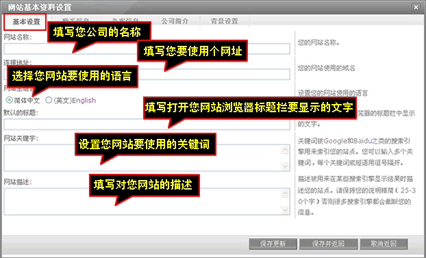 基本設(shè)置主要是填寫網(wǎng)站名稱、連接地址、網(wǎng)站主語(yǔ)言、默認(rèn)的標(biāo)題、網(wǎng)站關(guān)鍵字、網(wǎng)站描述,填寫完后記得點(diǎn)擊“保存更新”。