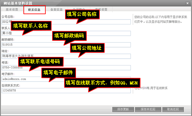 聯(lián)系信息主要填寫公司名稱、聯(lián)系人、郵政編碼、地址、電話、電子郵件、在線聯(lián)系方式,填寫完后記得點(diǎn)擊保存更新。