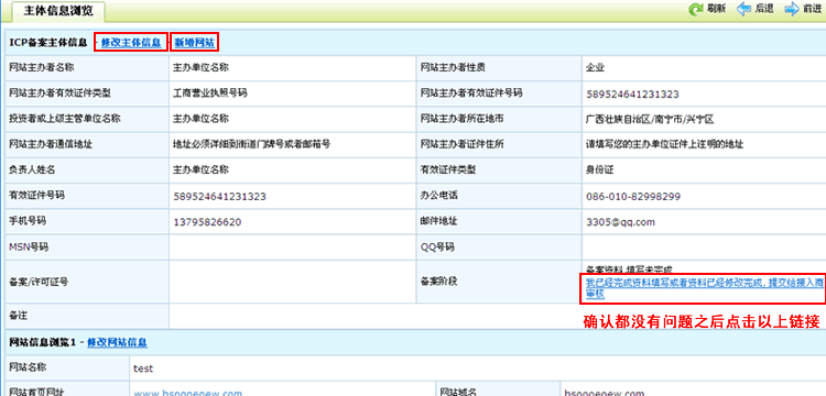 若需要修改網站負責人基本信息則修改,如不用修改,則提交申請,提交之后鏈接到