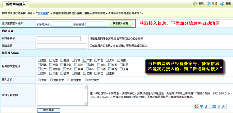 新網站接入:當您的網站已經有備案號,需要用我司空間,備案信息不是我司接入的,則需要進入到“新網站接入”