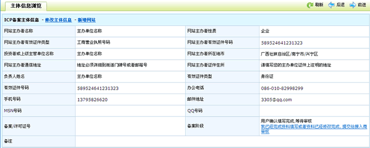 可以查看已經提交的備案的網站所有者信息、新增網站等。現在備案階段是, 用戶確認填寫完成,等待審核